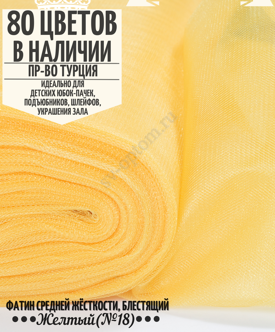 Фатин средней жесткости. Используется для изготовления праздничных и повседневных юбок, ярких сценических костюмов, в декоре свадеб, украшениях авто, упаковка подарков.